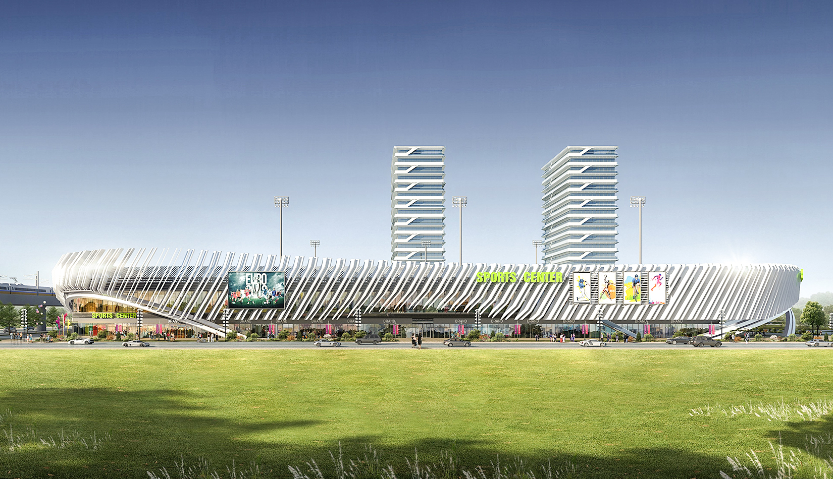 本項(xiàng)目提取高鐵動(dòng)車和海浪浪花的概念,用白色鋁板陣列與變化塑造出體育綜合體泛著浪花的海洋波浪造型。同時(shí)利用動(dòng)車動(dòng)感流線的造型設(shè)計(jì)出公寓的整體方案。海浪與動(dòng)車流線結(jié)合,不僅代表了青島的特色,更是詮釋了積極動(dòng)感的體育精神。將景觀引入建筑,以景觀打造形象,形成未來(lái)綜合體發(fā)展模式。