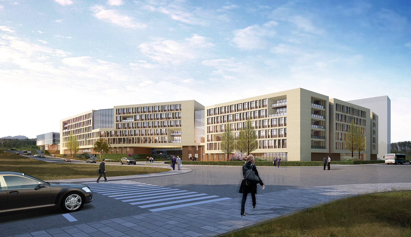 中國海洋大學(xué)老校區(qū)建筑為歐式建筑,采用紅瓦坡頂及淡黃色墻面,另有深棕線腳加以點綴。為傳承歷史文脈,強調(diào)文化特色,方案順應(yīng)西區(qū)生活區(qū)院落圍合布局,立面風(fēng)格設(shè)計為歐式風(fēng)格,結(jié)合屋頂、墻面及基座等細(xì)節(jié)設(shè)計,整體風(fēng)格與海大老建筑協(xié)調(diào)統(tǒng)一。主要出入口處,提取海大典型建筑元素,設(shè)計大氣的入口大門形象,與海大老校區(qū)建筑遙相呼應(yīng)。