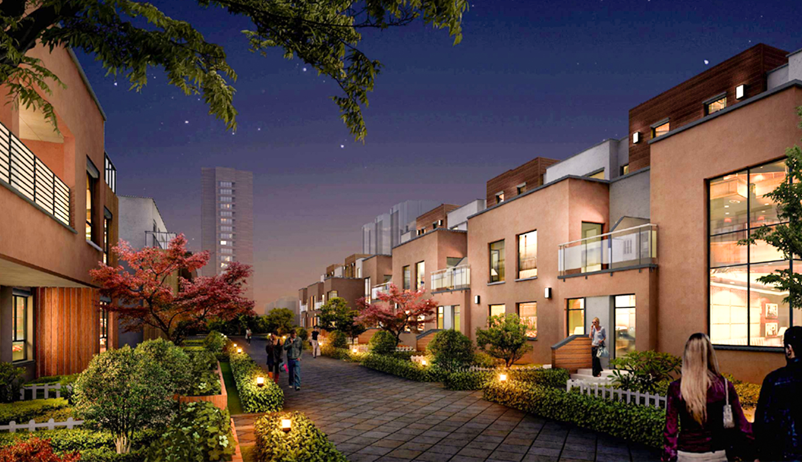 破了整體構(gòu)圖的橫向長度,橫向的黃色體塊進(jìn)一步在立面上縮小了體量,兩者通過穿插關(guān)系鑲嵌在白色的大體塊上,成組的白色線性元素像從體塊中生長出來,豐富了建筑立面,加強(qiáng)了節(jié)奏感。