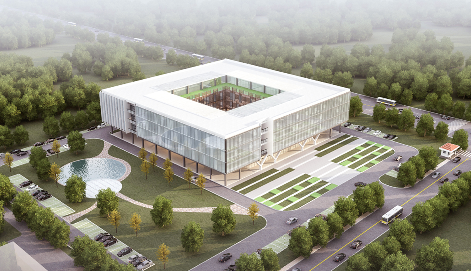 項(xiàng)目以辦公空間的合理性、實(shí)用性、靈活性作為設(shè)計(jì)點(diǎn),運(yùn)用綠廊、簡(jiǎn)約立面等手法將企業(yè)文化與生態(tài)辦公理念相融合,同時(shí)充分考慮和拓展設(shè)計(jì)中的可能性,從而營造出怡人的辦公空間和景觀環(huán)境。