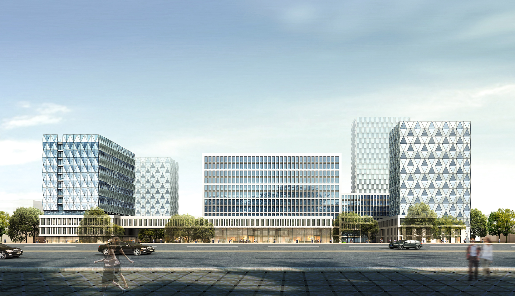 建筑立面風(fēng)格現(xiàn)代簡潔,高層塔樓以玻璃與金屬幕墻為主,塑造其硬朗簡潔的建筑性格,內(nèi)部兩棟建筑采用格構(gòu)式立面風(fēng)格,同樣以簡潔為設(shè)計原則,展現(xiàn)其富有理性秩序的立面形象。