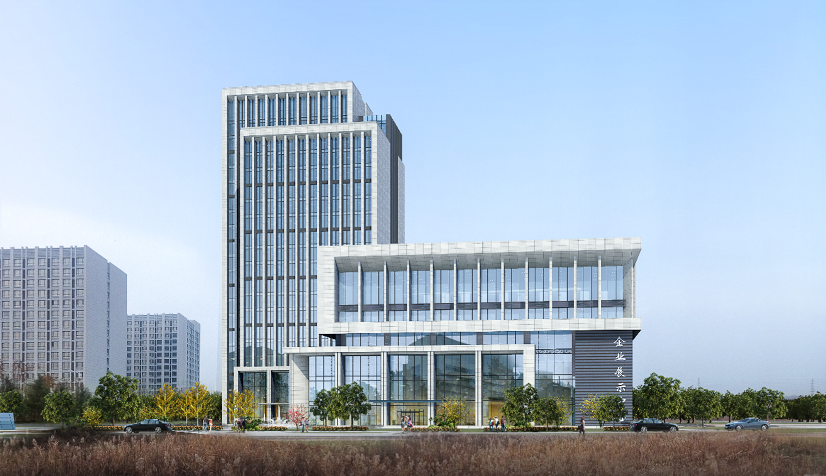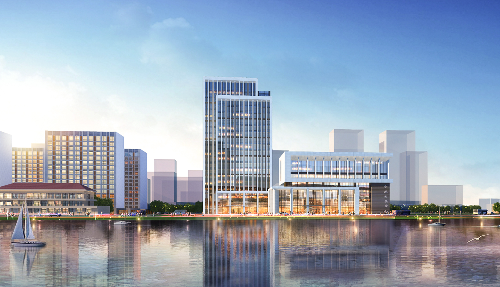充分利用城市景觀,并形成了自身的樓前集散廣場綠化、沿河休憩景觀,建筑西側(cè)公共景觀廣場綠化三大塊景觀帶,并通過景觀軸將三部分聯(lián)系起來。