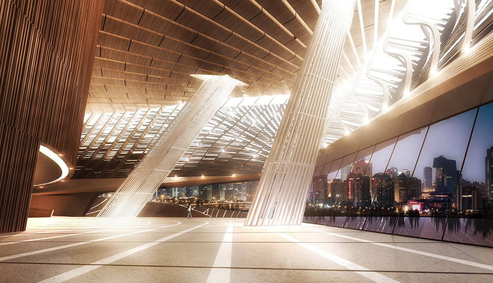 觀眾廳整體空間形態(tài)采用馬蹄形設(shè)計,觀眾廳建聲采用聲學墻與裝飾墻結(jié)合的方式。延建筑東南部呈“U”型環(huán)繞觀眾廳布置,觀眾二層、三層休息廳設(shè)置吹拔,結(jié)合兩側(cè)連續(xù)坡道,構(gòu)成游走空間,將各層休息廳在空間上相互連通,并結(jié)合建筑表皮,形成莊重、典雅又不失生動的空間體驗。