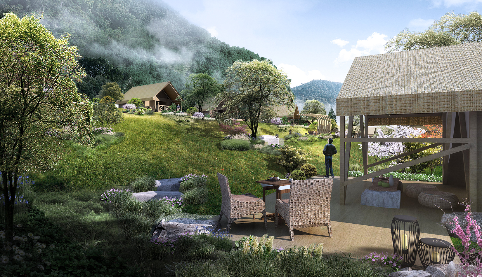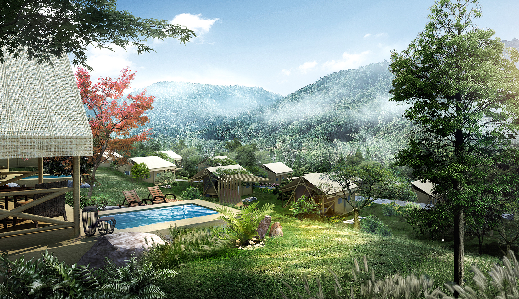 景觀設(shè)計從野奢度假酒店的“野”和“奢”兩字入手,融入荒野生態(tài)的設(shè)計理念,又要與場地相融合、與原生態(tài)相映、與當(dāng)?shù)氐拿袼罪L(fēng)情相交匯,突出當(dāng)?shù)氐奈幕黝},強調(diào)高品質(zhì)的自然、野奢度假,從而打造出一個具備個性與特色,使游客能夠享受到自然野趣體驗的景觀環(huán)境。