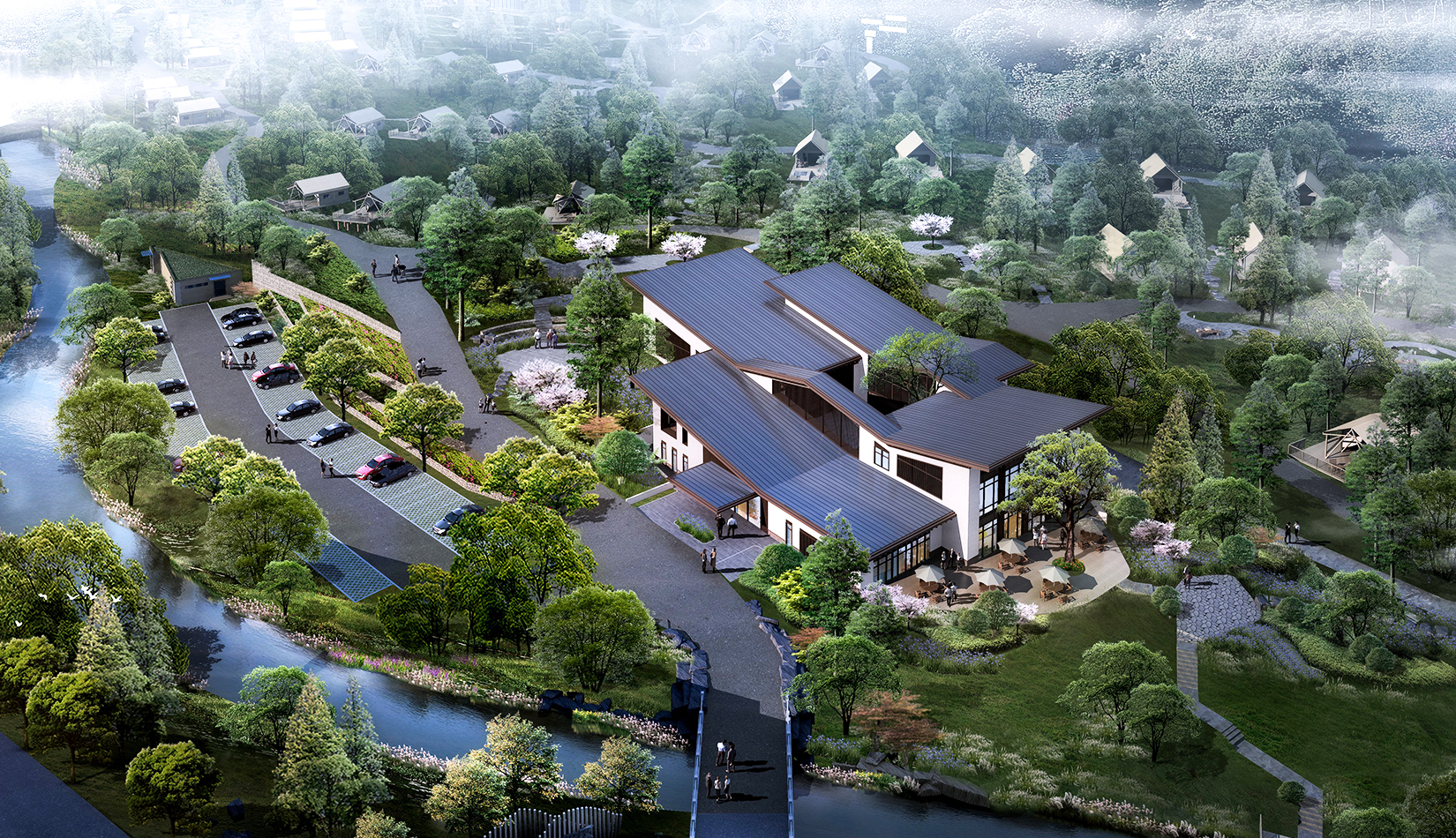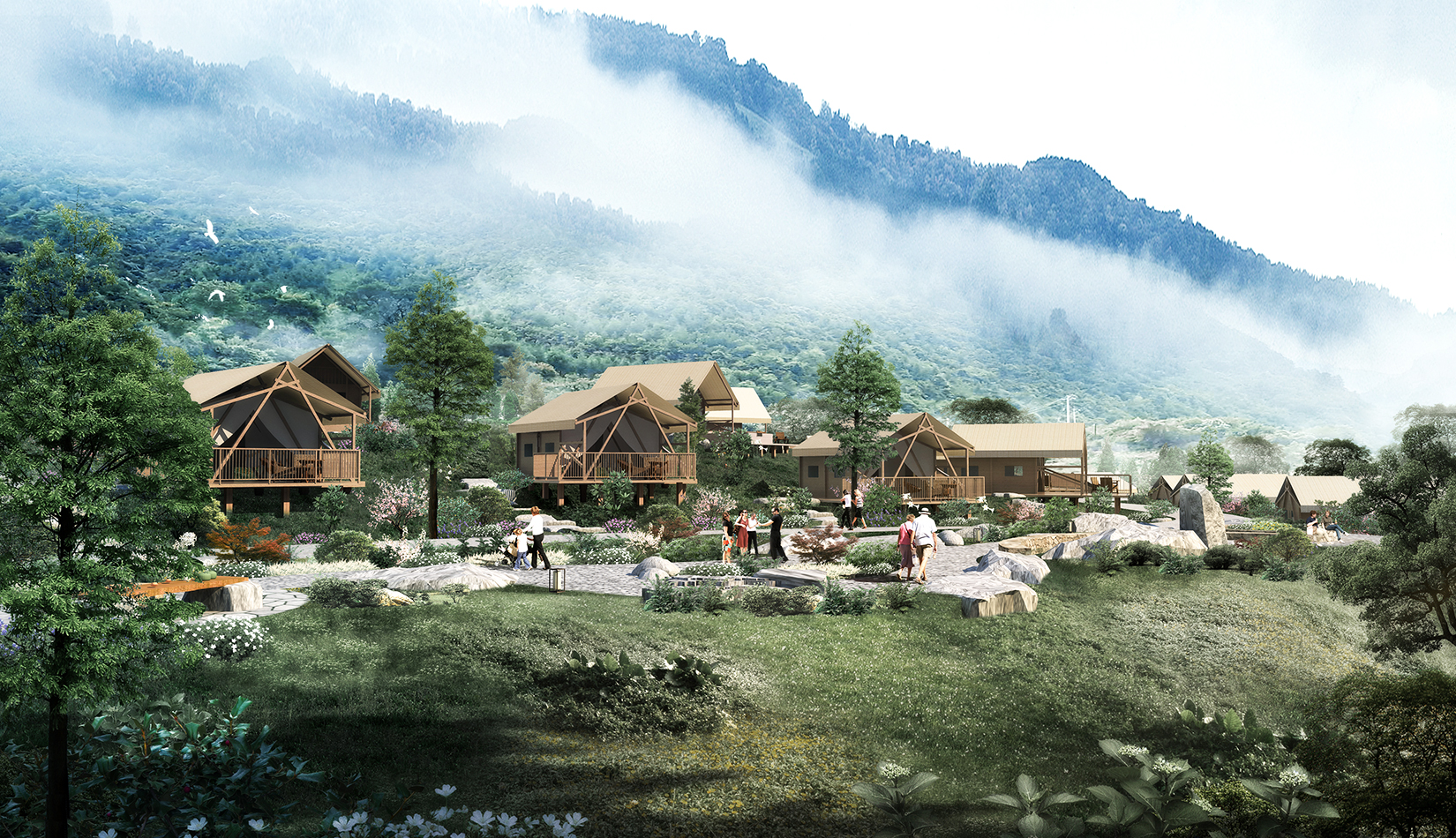 根據(jù)基地的地勢分布及功能需求,空間結(jié)構(gòu)上分為“一帶兩軸三核心五組團”。建筑設(shè)計的五個組團,分別是濱水休閑組團、水畔風(fēng)光帳篷組團、高端養(yǎng)心帳篷組團、中心服務(wù)組團及山居野趣帳篷組團??头坎糠植捎脦づ穸燃傥莸姆绞?,凸顯野奢度假的浪漫形式。