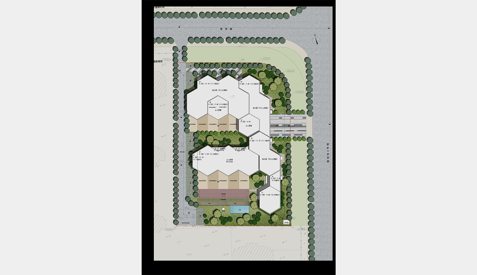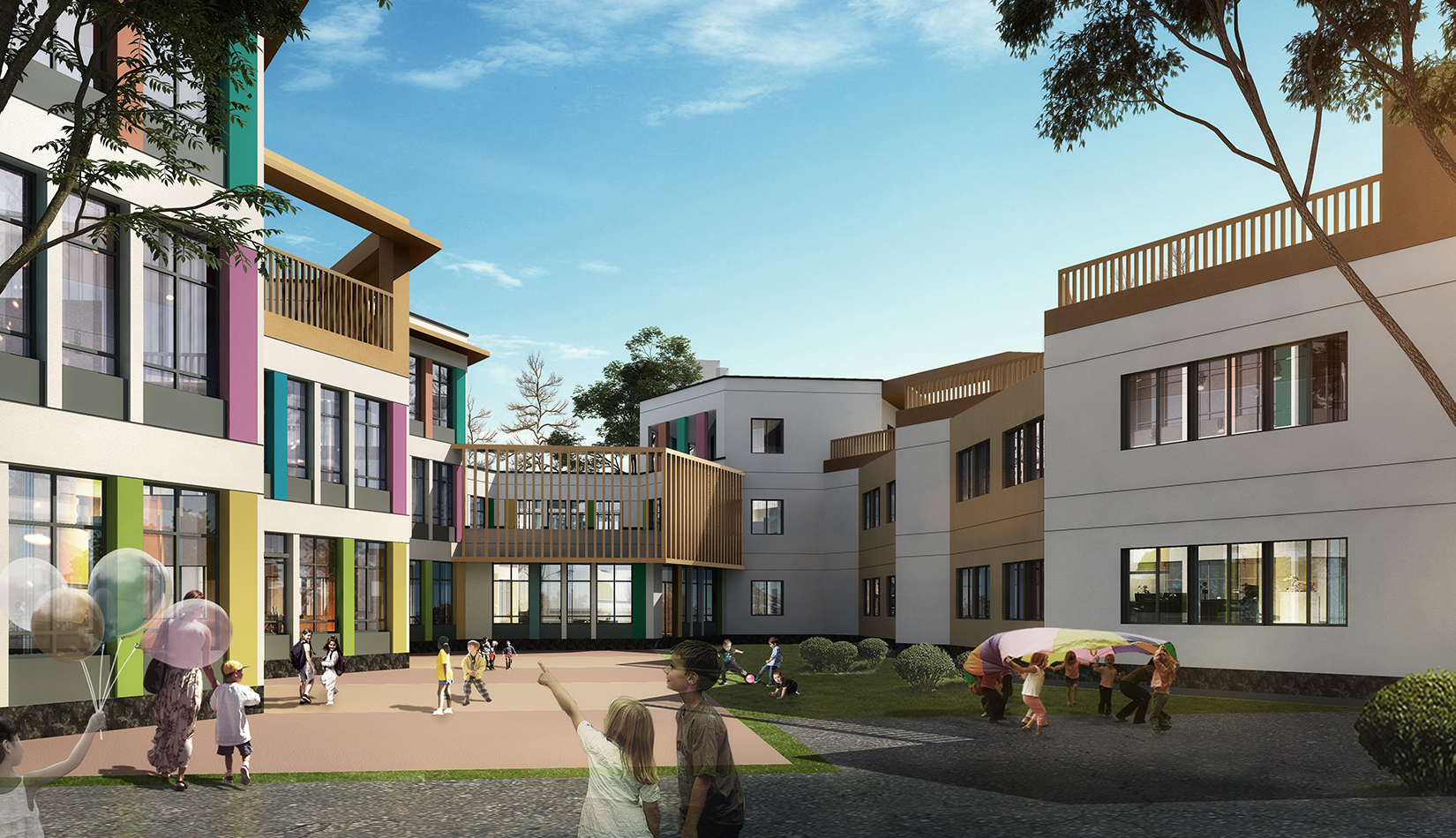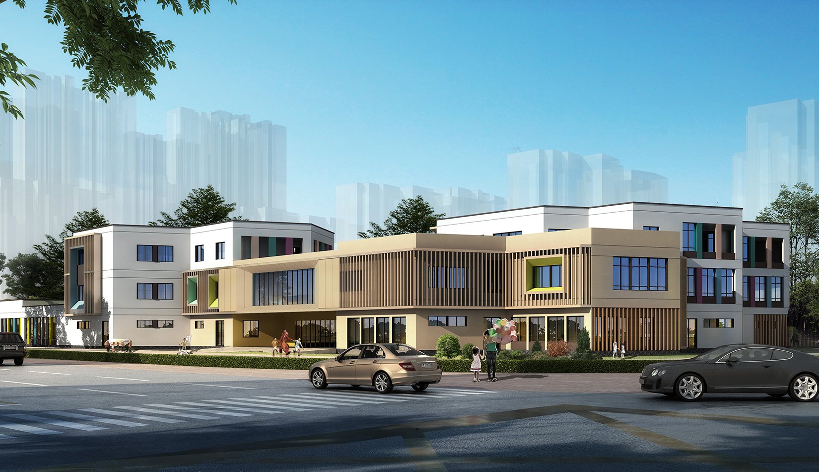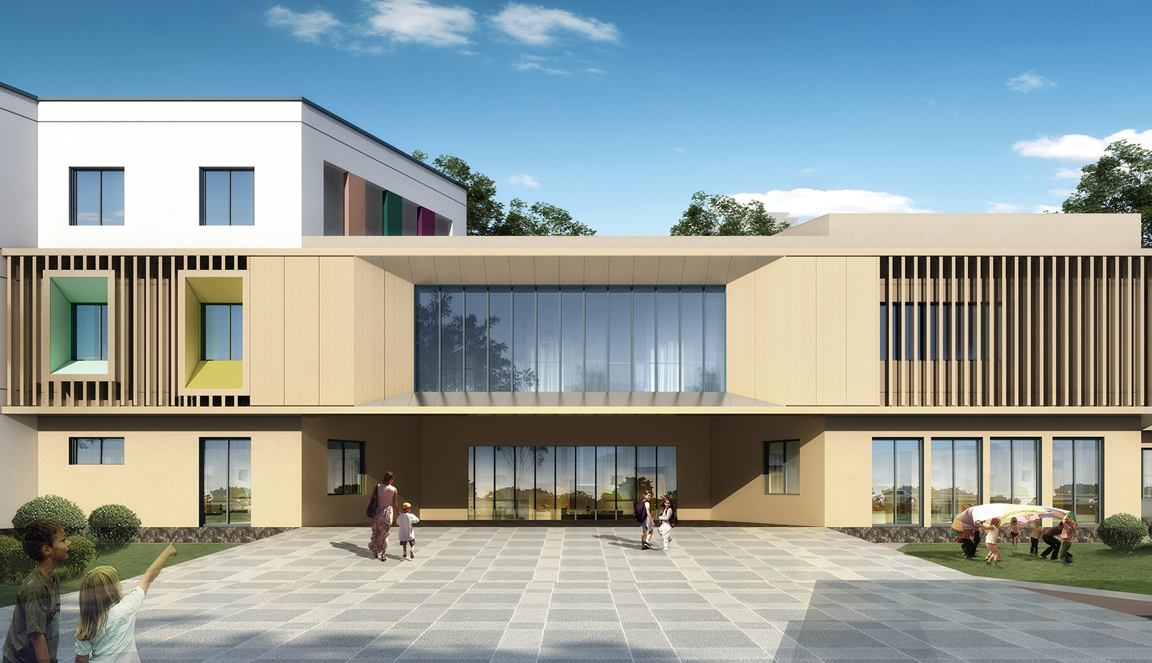 整體建筑以暖色調(diào)為主,旨在為幼兒營造一種溫馨的環(huán)境氛圍,以紅色陶土板為基調(diào),與周邊古典風(fēng)格的住宅區(qū)相融合。彩色的運(yùn)用象征著孩子活潑多彩的個(gè)性,迎合了孩子對(duì)色彩的敏感特性,營造出一種五彩斑斕的活潑的環(huán)境氛圍;彩色具有強(qiáng)調(diào)作用,可以突出建筑作為幼兒園的功能性,同時(shí)白色作為整體環(huán)境的基調(diào)色,協(xié)調(diào)了不同色彩間的沖突感受,使建筑氛圍呈現(xiàn)簡潔明凈而又突顯夢幻的特點(diǎn)。