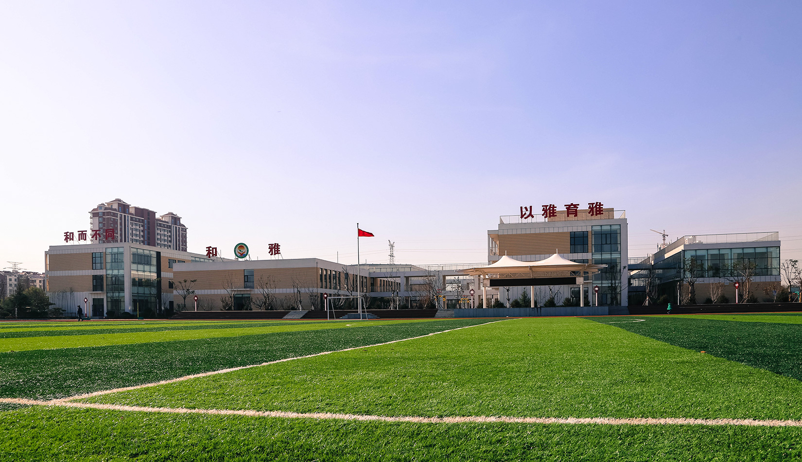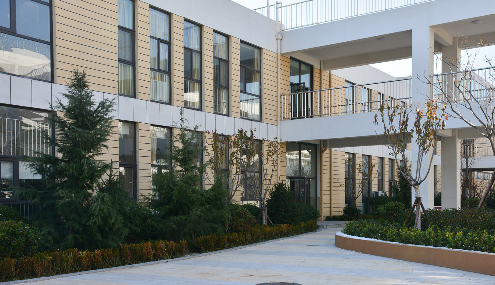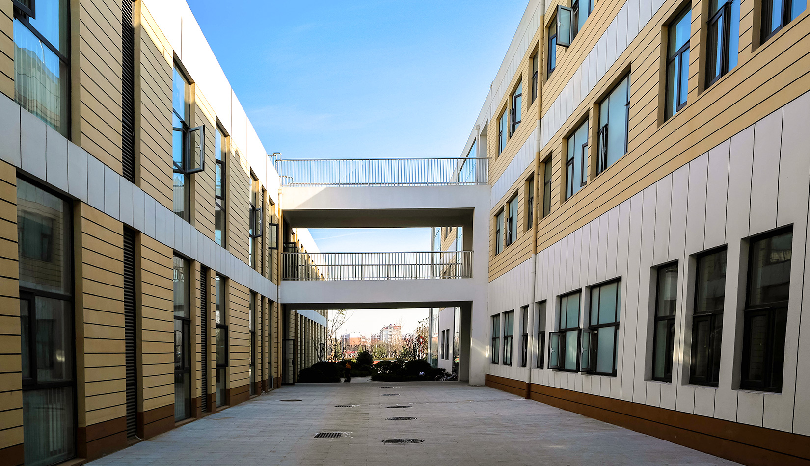 該項(xiàng)目通過(guò)幾個(gè)建筑單體與架空走廊的穿插連接將整個(gè)校區(qū)有機(jī)聯(lián)系起來(lái),實(shí)現(xiàn)了建筑功能的整體性,完善了建筑可達(dá)性。形成的中庭空間可成為交流為主的平臺(tái),營(yíng)造了學(xué)習(xí)、活動(dòng)為一體的校園氛圍。建筑外立面以簡(jiǎn)潔的現(xiàn)代風(fēng)格為主,同時(shí)表現(xiàn)校園文化,主要采用黃色與白色真石漆形成色彩對(duì)比,在教室南立面、樓梯間、就餐區(qū)等采用整體通透的玻璃幕墻與實(shí)墻形成虛實(shí)對(duì)比,形成簡(jiǎn)潔而不失活潑的建筑風(fēng)格。利用借景等手法進(jìn)行室外綠化設(shè)計(jì),整體打造一個(gè)高品質(zhì)的學(xué)校環(huán)境。