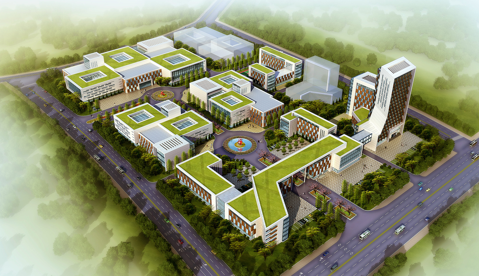 設(shè)計中著重實現(xiàn)“產(chǎn)業(yè)有核體”理念。依據(jù)功能不同,各自以庭院、廣場的形式形成獨立核心。以類似“綜合體”的形式實現(xiàn)各自功能分區(qū)的獨立完整。兩大功能核心體主軸線體系為基礎(chǔ)進(jìn)行串聯(lián),在保證相互間直達(dá)性的同時又互不干擾。