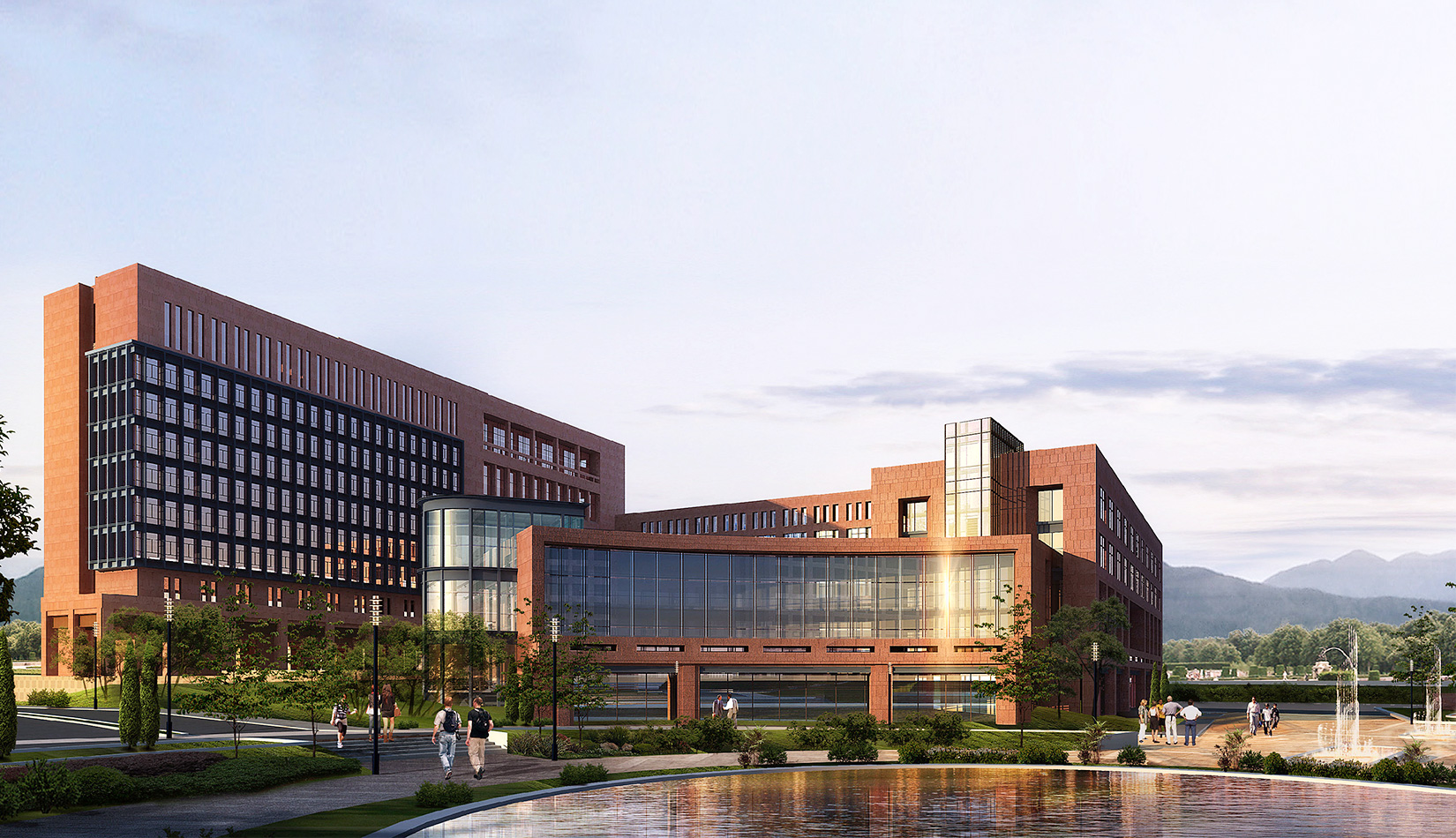 總體的規(guī)劃布局圍繞中心景觀廣場展開設(shè)計。首先從山區(qū)建筑布局師法自然,藏風(fēng)聚氣的傳統(tǒng)觀念出發(fā),結(jié)合現(xiàn)代科學(xué)嚴(yán)謹(jǐn)求真務(wù)實的態(tài)度,設(shè)計以東側(cè)入口廣場導(dǎo)入的中心景觀空間圍合展開規(guī)劃布局,總體上根據(jù)土地的使用性質(zhì)分為四個區(qū),分別是正對主入口北側(cè)的生活區(qū),南側(cè)的孵化中心區(qū),正對主入口廣場的科研辦公區(qū),以及整個用地最南端的產(chǎn)業(yè)開發(fā)區(qū),各個區(qū)既相互獨(dú)立同時又緊密聯(lián)系,功能上即考慮主導(dǎo)風(fēng)向又方便使用。