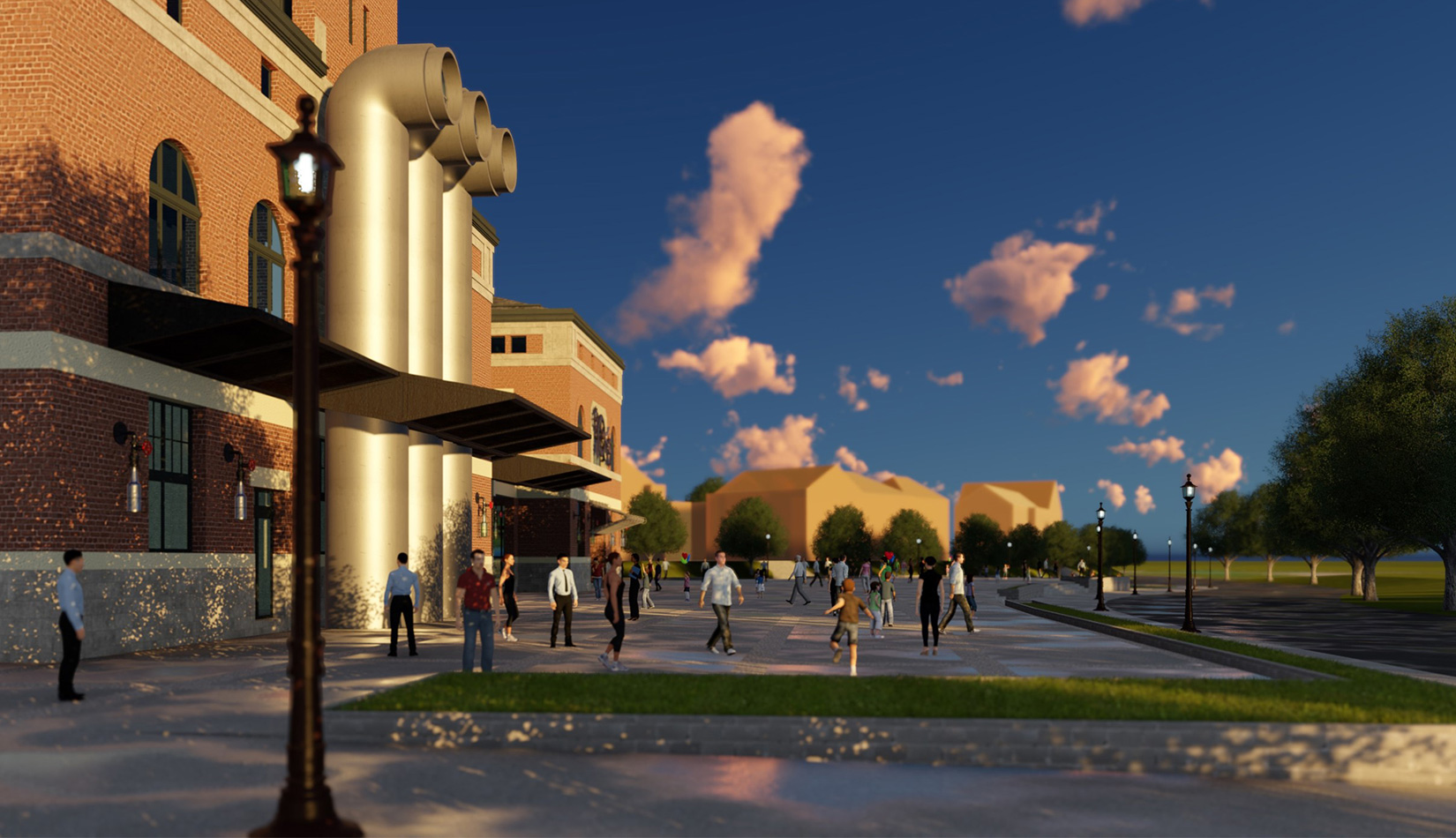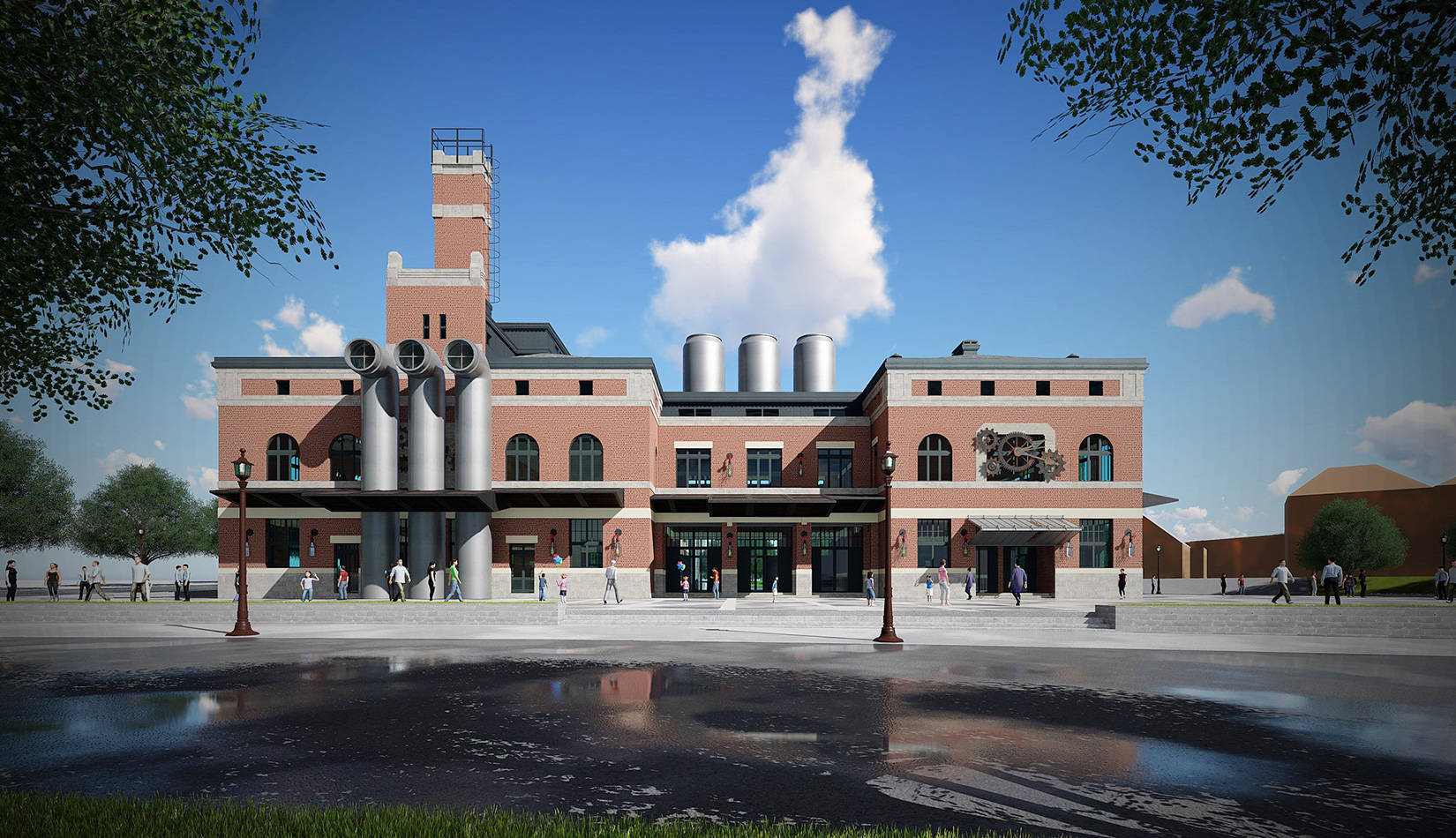 紅磚是工業(yè)風(fēng)的最佳表現(xiàn)元素之一,本案選取紅磚作為立面主要材質(zhì),加以真石漆、石材進(jìn)行點(diǎn)綴,磚塊與磚塊中的縫隙可以呈現(xiàn)有別于一般墻面的光影層次。屋面形式選取深灰色瓦屋面加以深色金屬板點(diǎn)綴,與立面形成強(qiáng)烈的視覺對(duì)比,旨在體現(xiàn)工業(yè)風(fēng)的粗獷氛圍。