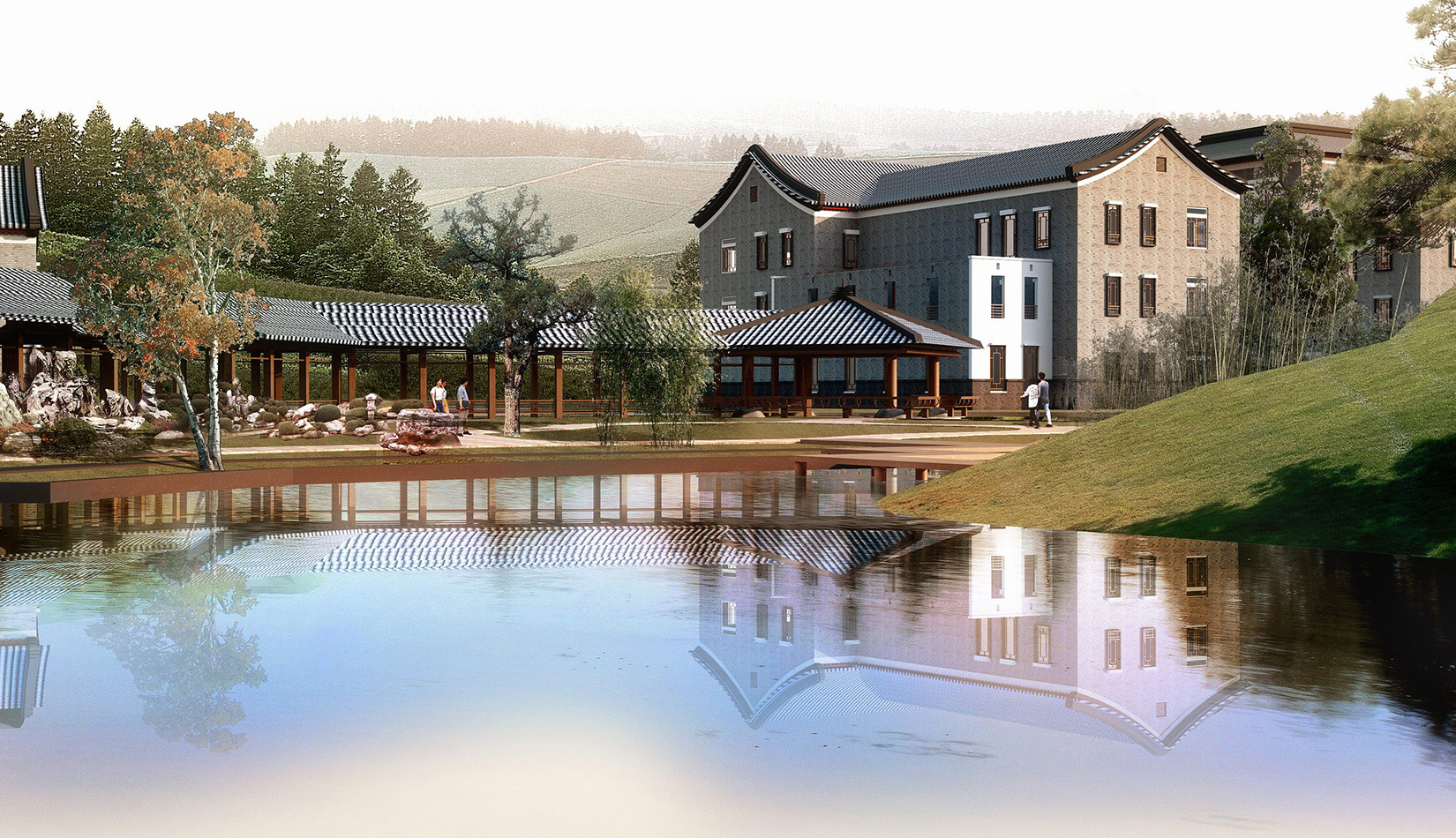 在構思和總體布局上引入“潛龍情節(jié)”。結合用地南北狹長、北面臨海的地形特征和自由靈活的建筑布局,將中華民族的文化象征——龍圖騰與傳統(tǒng)文化的燦爛之花——書畫藝術相結合,將主要軸線以龍為形,寓意著書畫藝術的振興和華夏文化的騰飛。