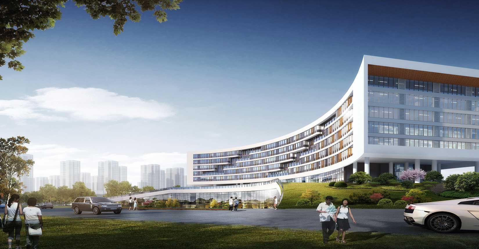 考慮到用地形狀、使用功能和日照等條件因素的影響,總平面布局以“生長(zhǎng)”為主題,寓意生命向上生長(zhǎng)的力量,生生不息,無限伸展。枝杈無限分支向上生長(zhǎng),象征著無限的力量與生機(jī)。而中醫(yī)的健康講究氣血通暢,循環(huán)往復(fù),從而衍生出“五行”相輔相成的設(shè)計(jì)理念。根據(jù)五行方位確定五行主題。將金水湖與建筑相融合,金水湖為“水”,輔“金”“木”“火”“土”四個(gè)主題廣場(chǎng)。